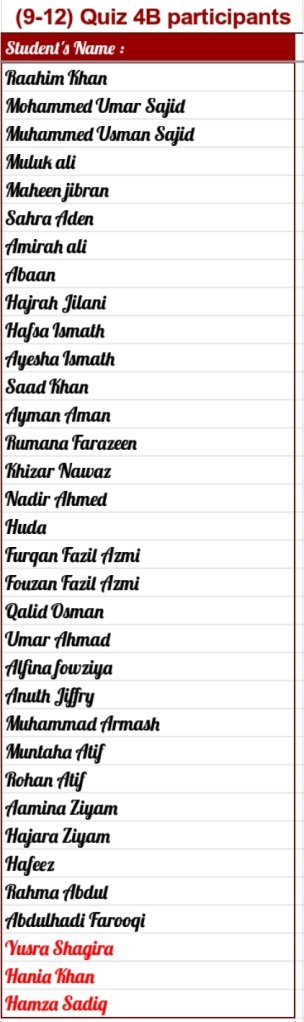 Quiz 4B – Ages 9-12 Posted byNurun-Ala-NoorJuly 1, 2021Posted inQuiz Results Quiz 4B (9-12) Share this: Click to share on X (Opens in new window) X Click to share on Facebook (Opens in new window) Facebook Like Loading... Related