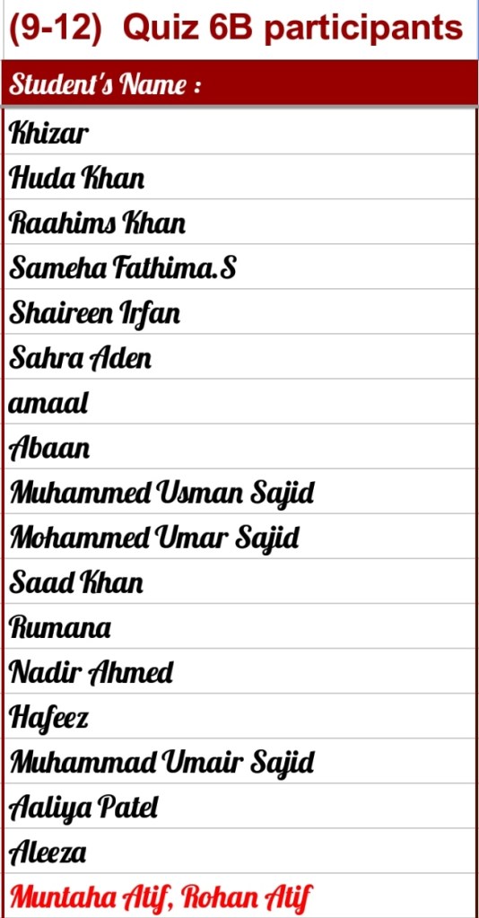 Quiz 6B – Ages 9-12 Posted byNurun-Ala-NoorSeptember 7, 2021Posted inQuiz Results Quiz 6B (9-12) Share this: Click to share on X (Opens in new window) X Click to share on Facebook (Opens in new window) Facebook Like Loading... Related